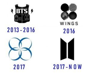 Before this change, the 2013 logo was in use, which featured a bulletproof vest. It represented their original name Bangtan Sonyeondan (“Bulletproof Boy Scouts”), symbolizing strength and resistance.