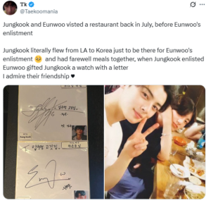 The two idols were spotted dining together at a popular restaurant. Not only did they enjoy a delicious meal, but they also left autographs for the restaurant owner. A fan later shared the heartwarming story on social media along with a photo of their signatures. That fan also revealed that before Jungkook’s enlistment in December 2023, Eun Woo had gifted him a special watch along with a handwritten letter. Jungkook was later proudly seen wearing that watch at Jin’s military discharge ceremony in June 2024.